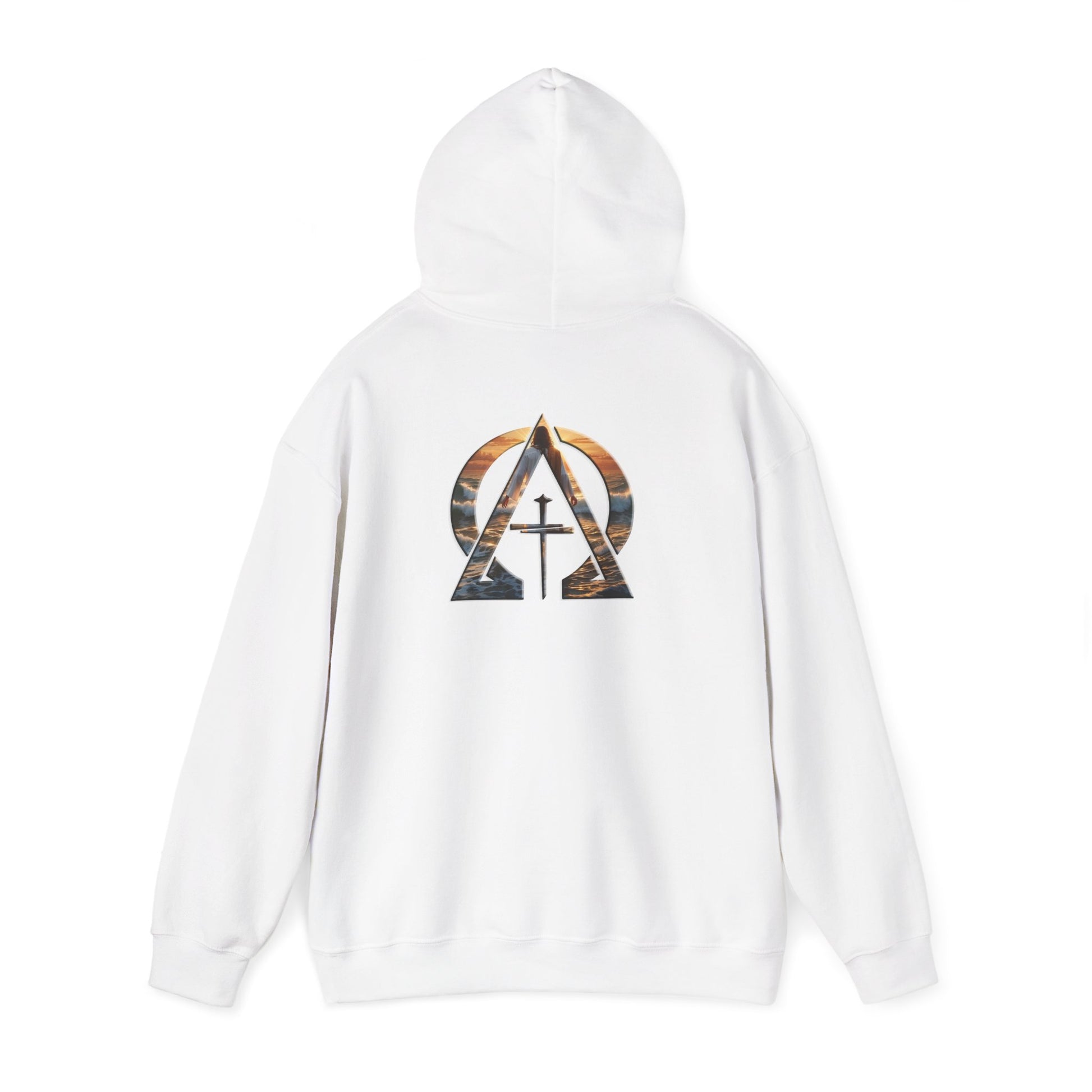 Declaring Your Destiny Blue & Gold logo/ Alpha & Omega Jesu Walking On Water Unisex Heavy Blend™ Hooded Sweatshirt