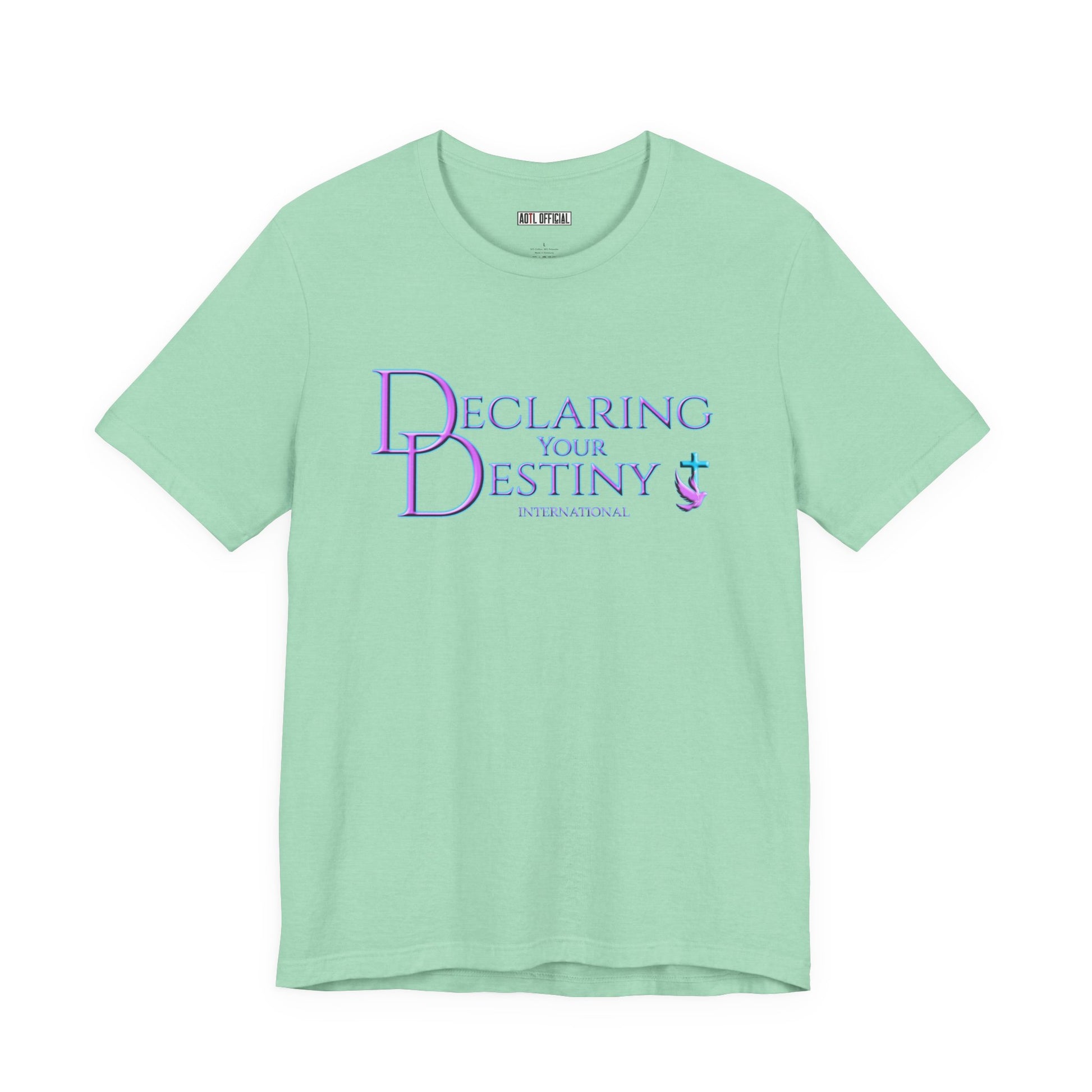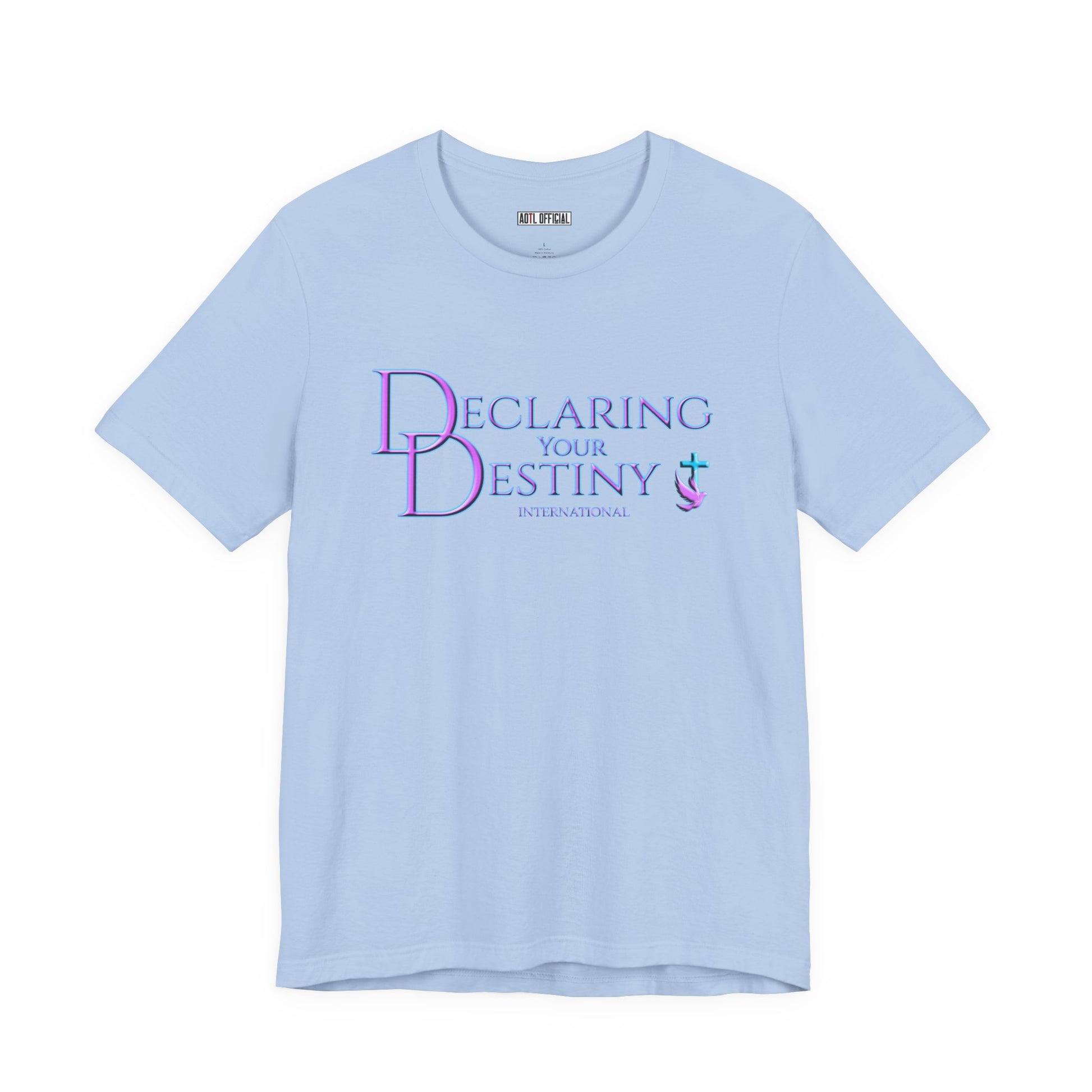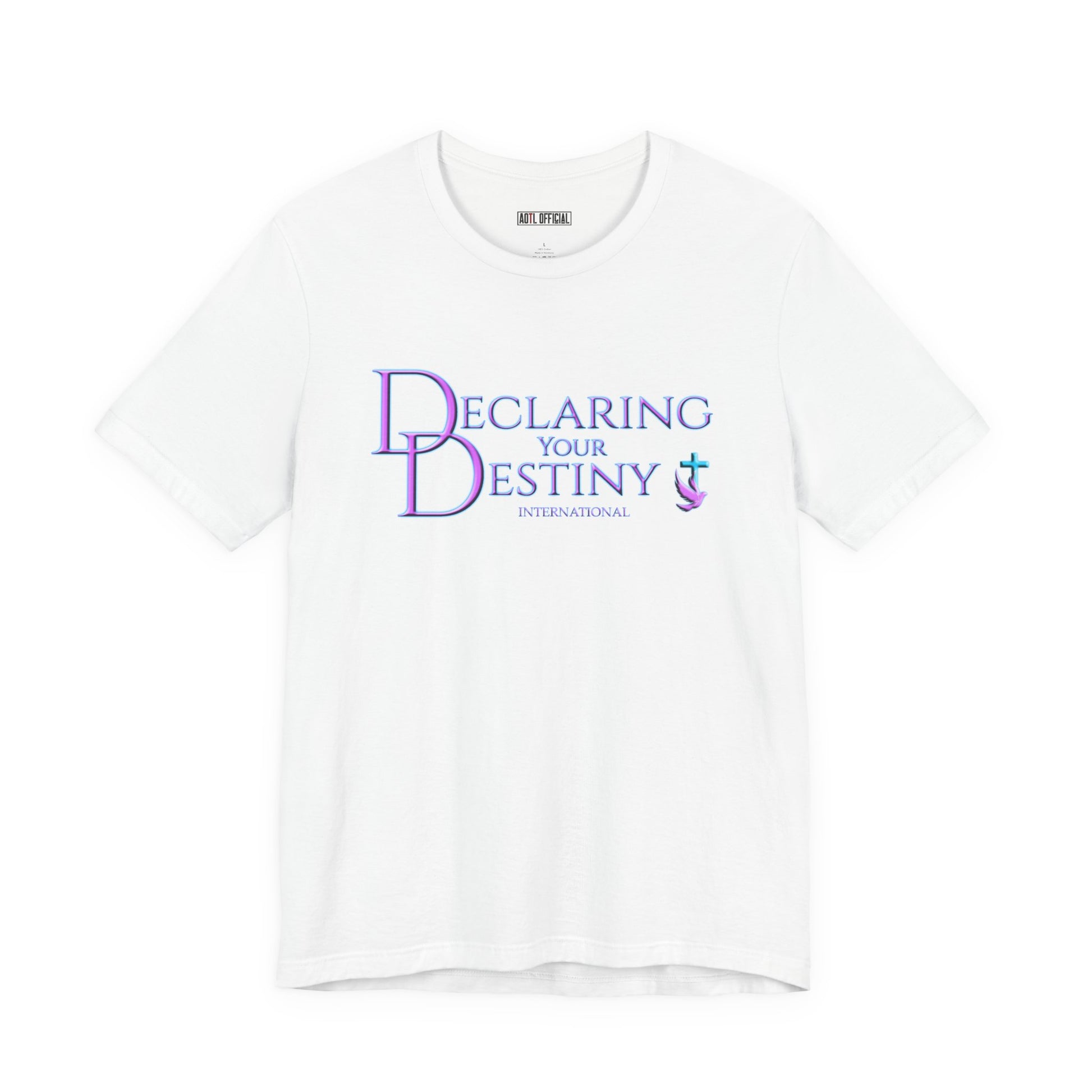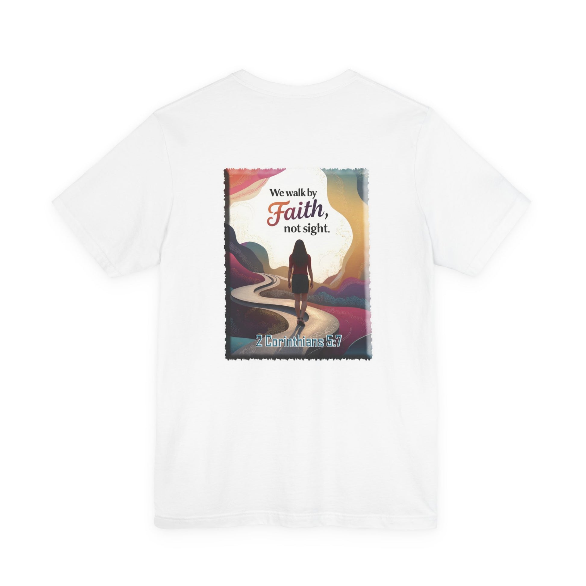 This beautifully crafted two sided t-shirt features the Declaring your Destiny logo in Lilac & Teal on the front, accompanied by an illustrated version of the Bible verse 2 Corinthians 5:7 on the back.