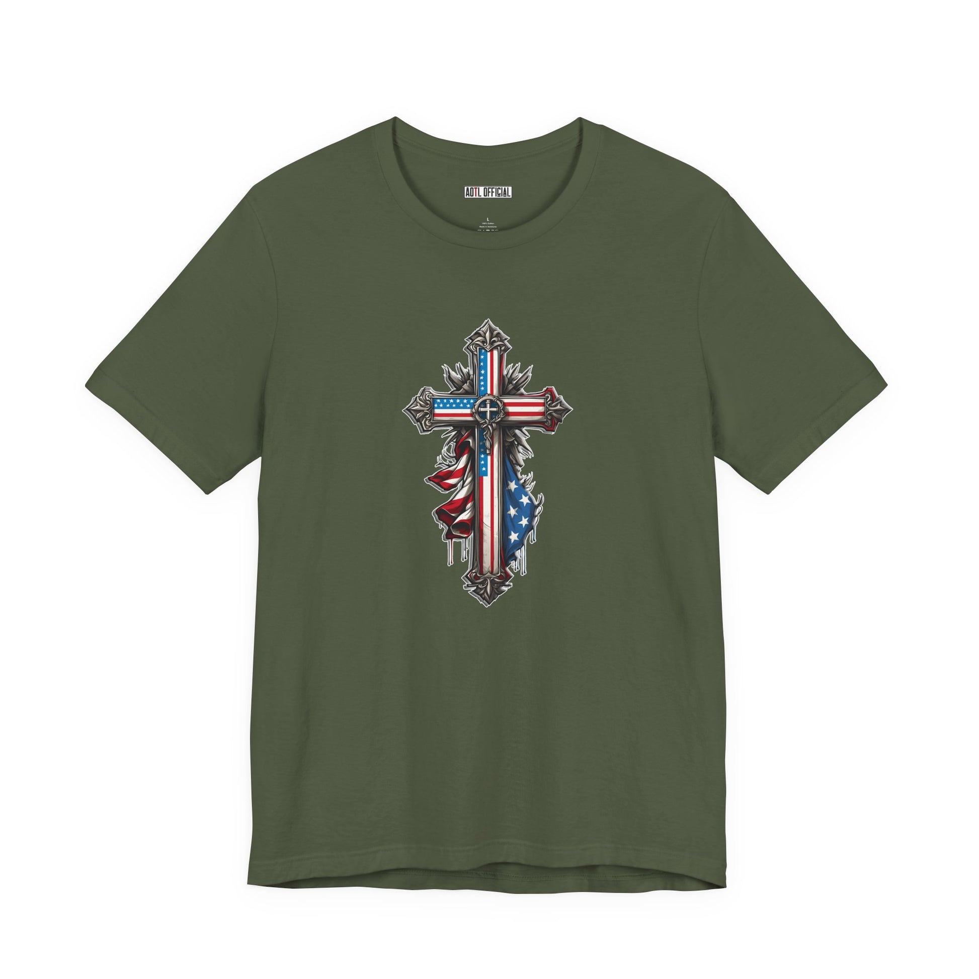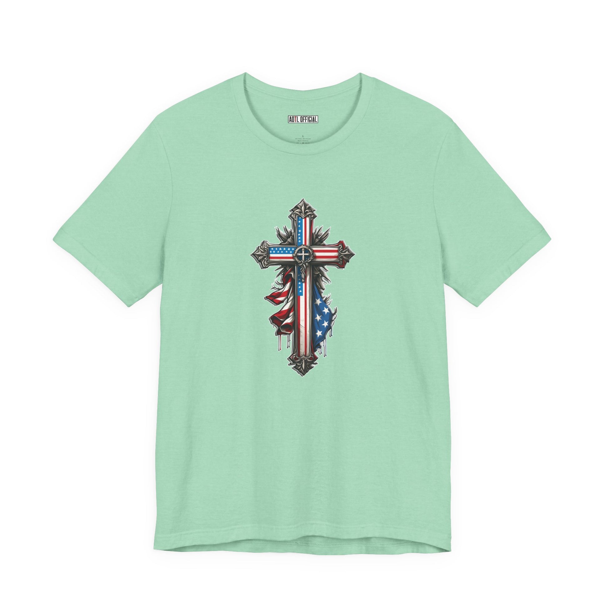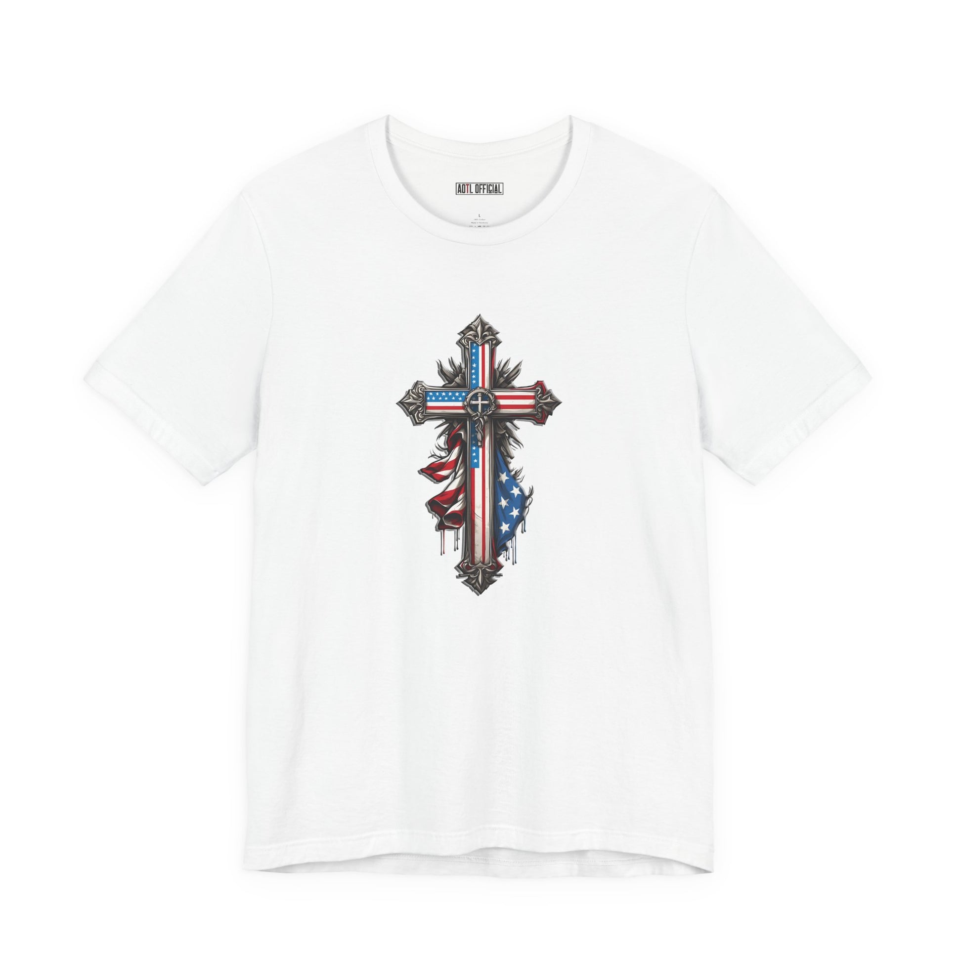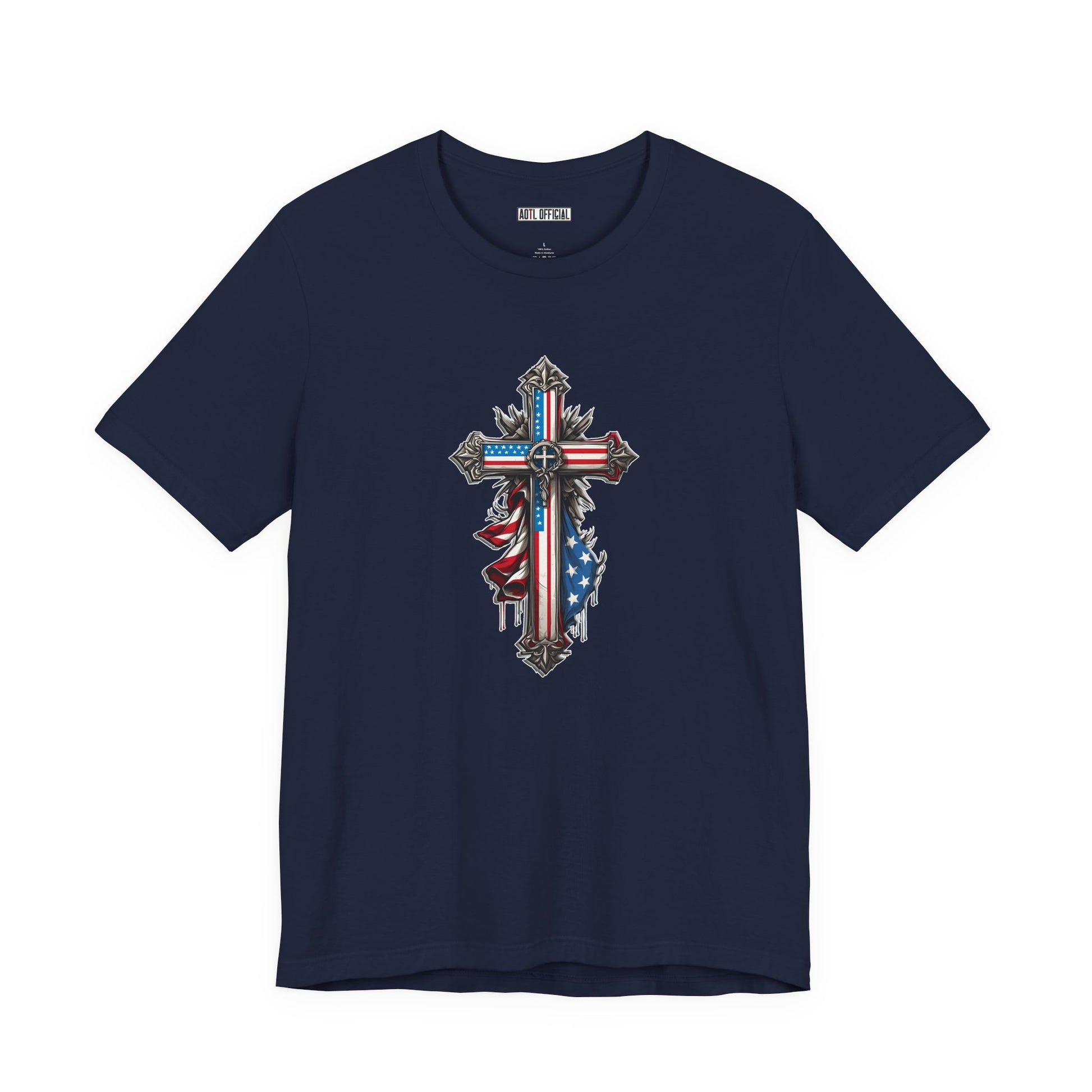 This emblem celebrates the fusion of faith and national pride, encapsulating the profound connection between spirituality and the American spirit. Wear this design as a visual testament to the harmonious devotion to both faith and country.