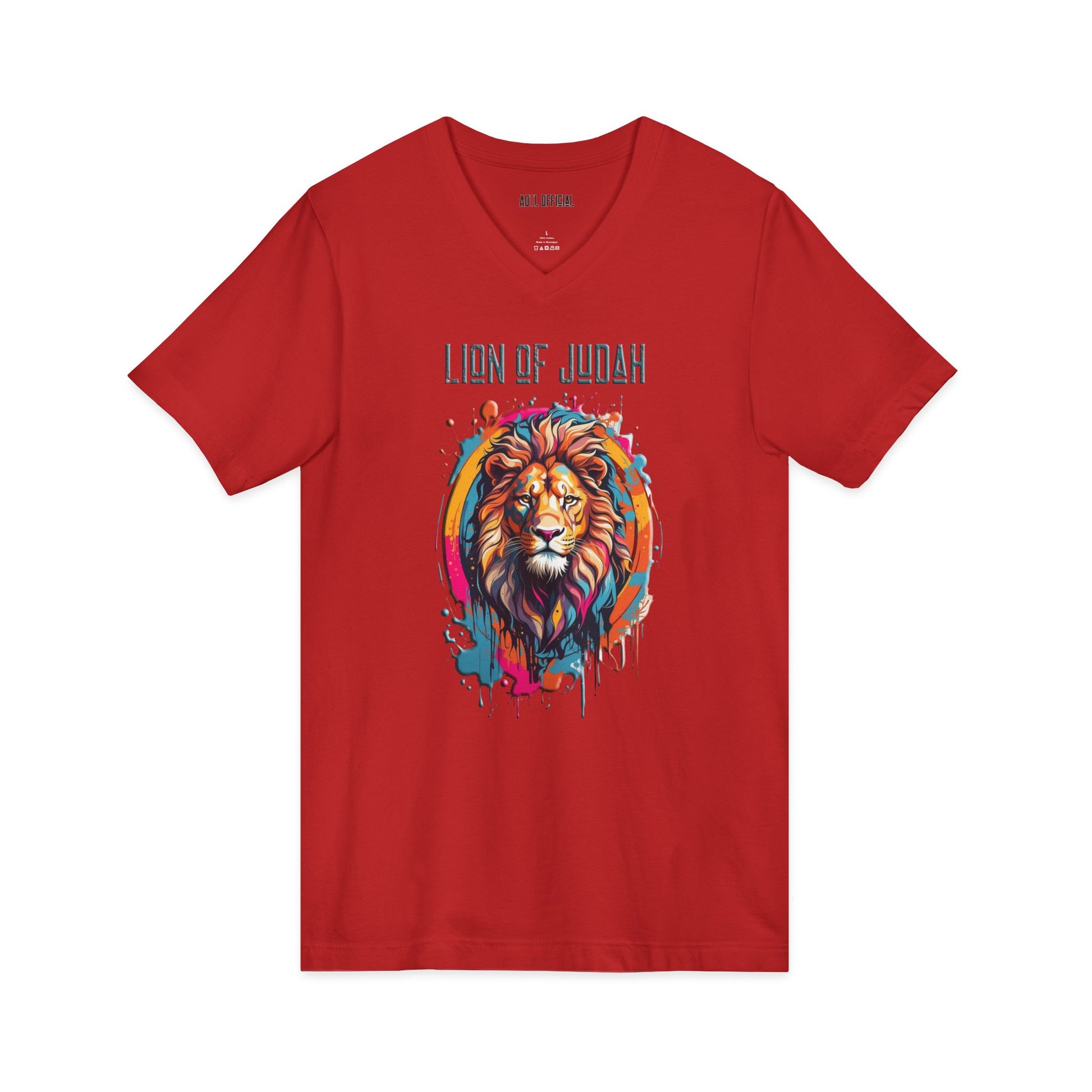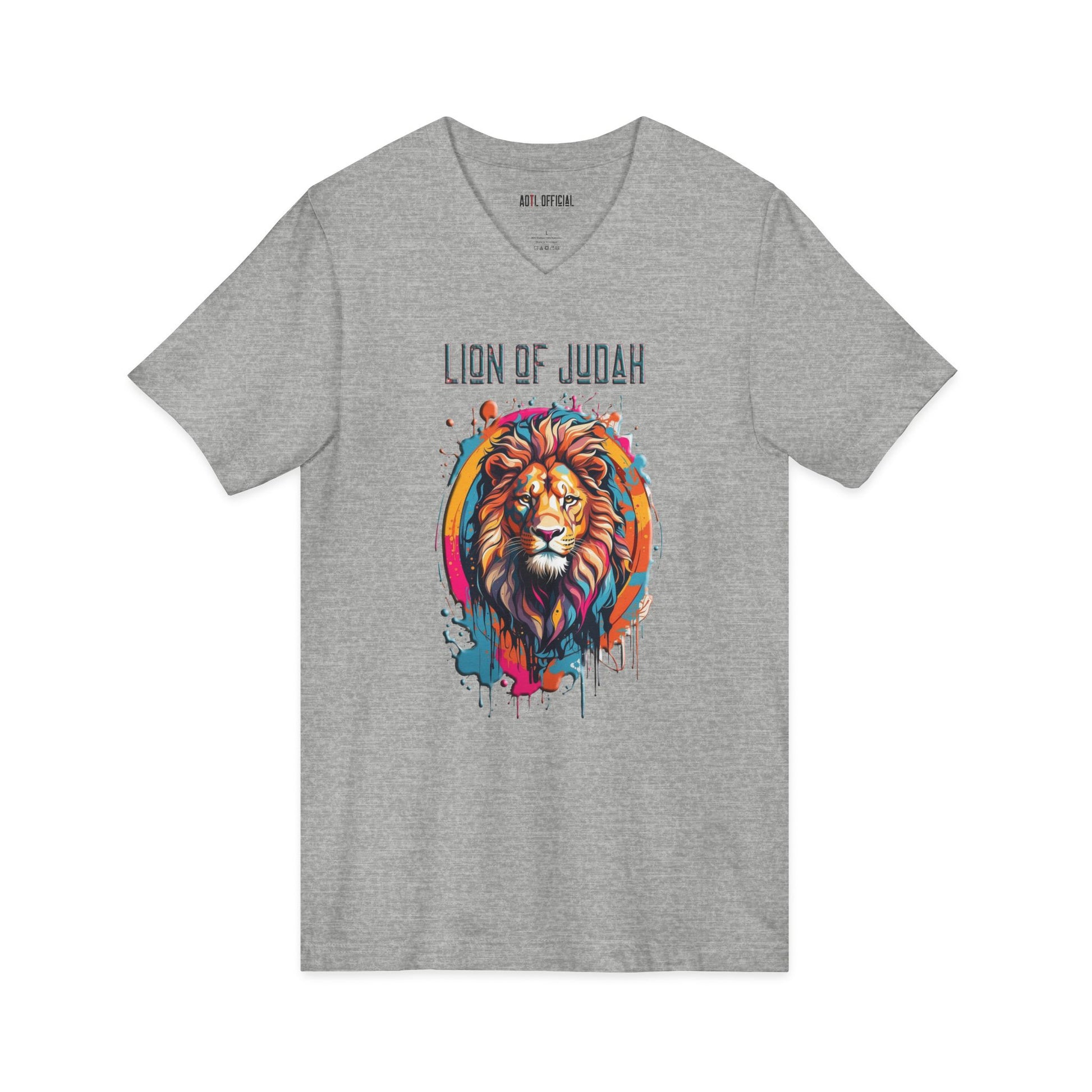 Embrace the majestic power of the Lion of Judah with our vibrant Graffiti Drip Edition V-neck T-Shirt. Designed with vivid colors and an urban graffiti-inspired paint drip look, this shirt is a bold statement of strength and courage. Let the lion's roar echo through the streets as you showcase your faith and style. Built-in details like a ribbed V-neck, shoulder tape, and side seams keep the shirt looking sharp after repeated wear.