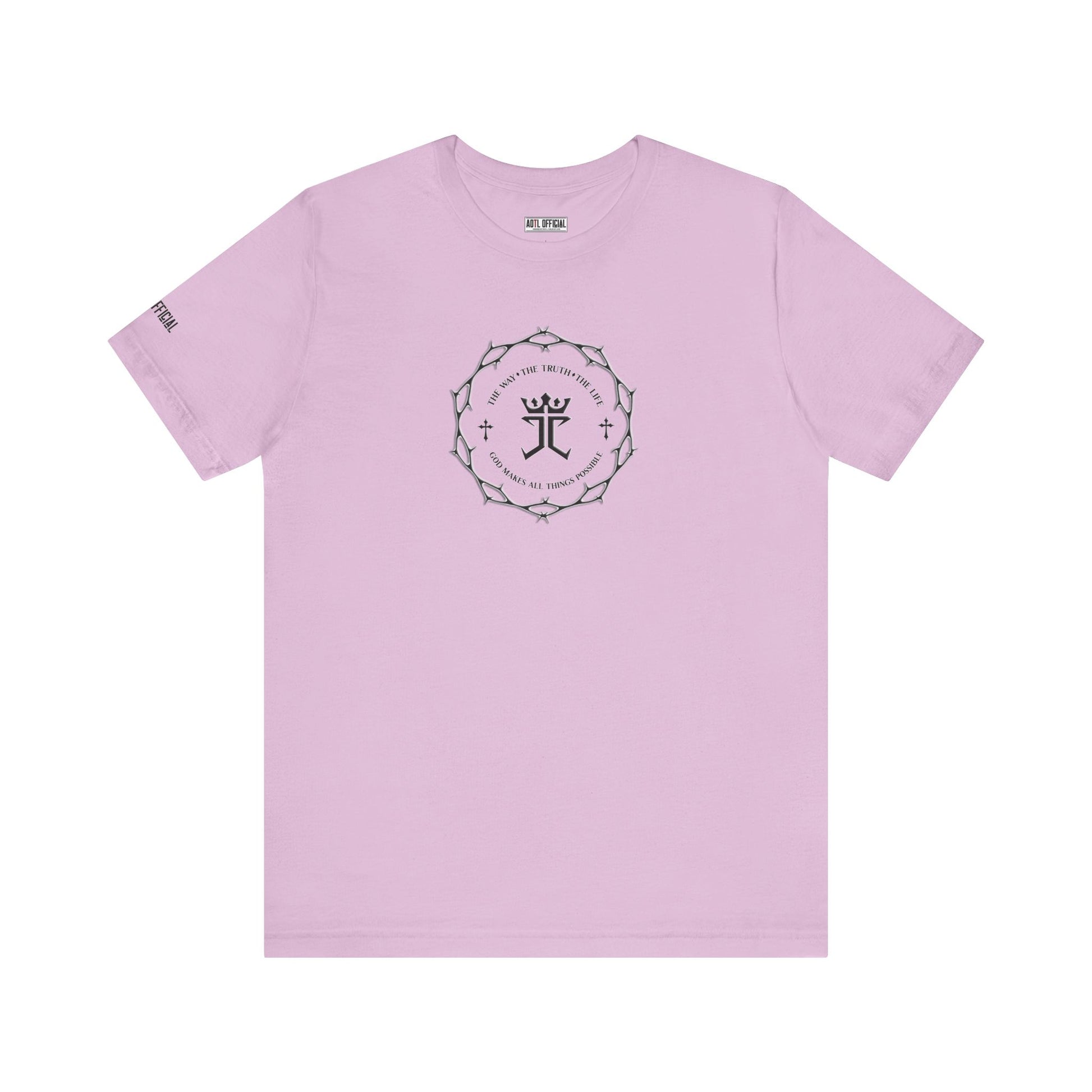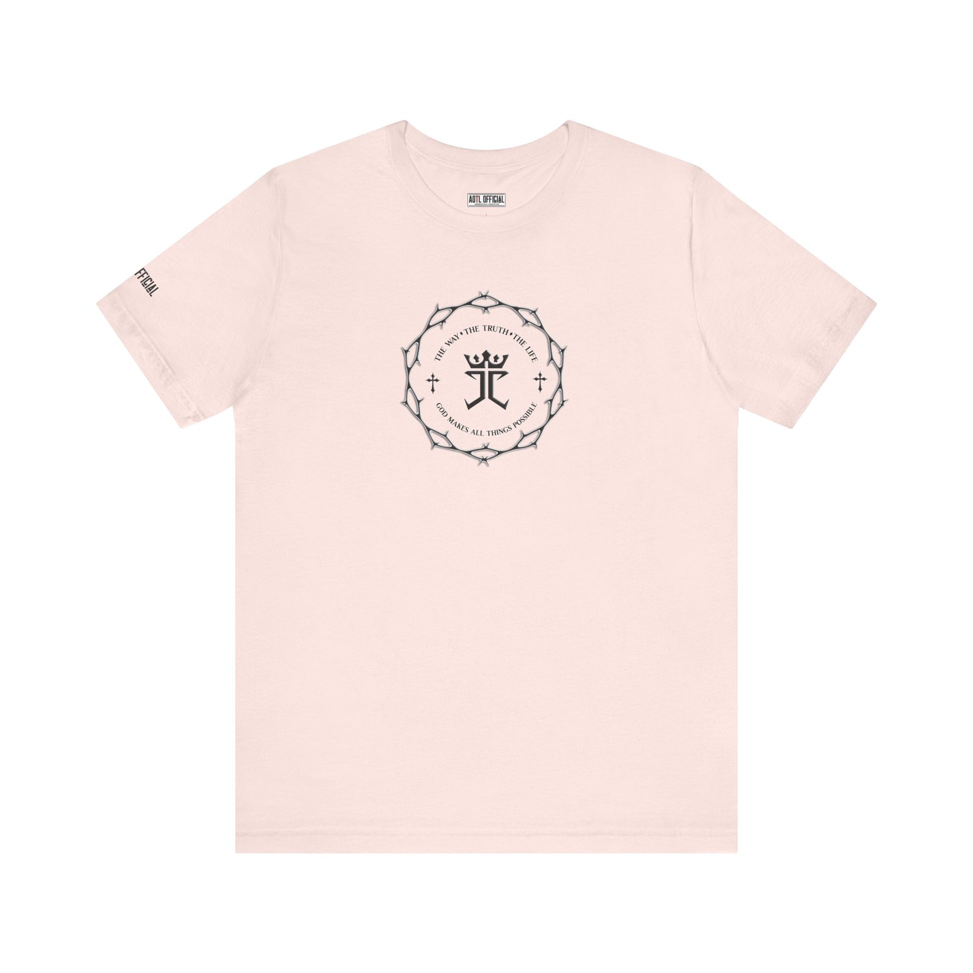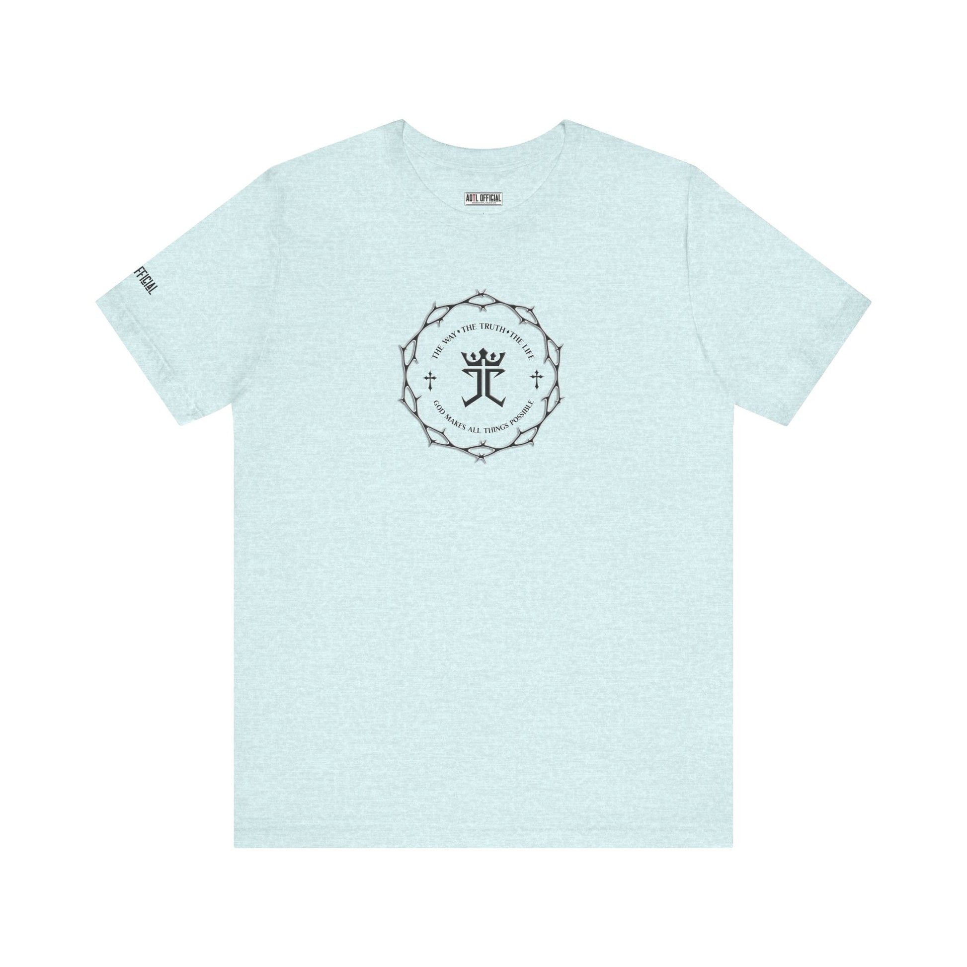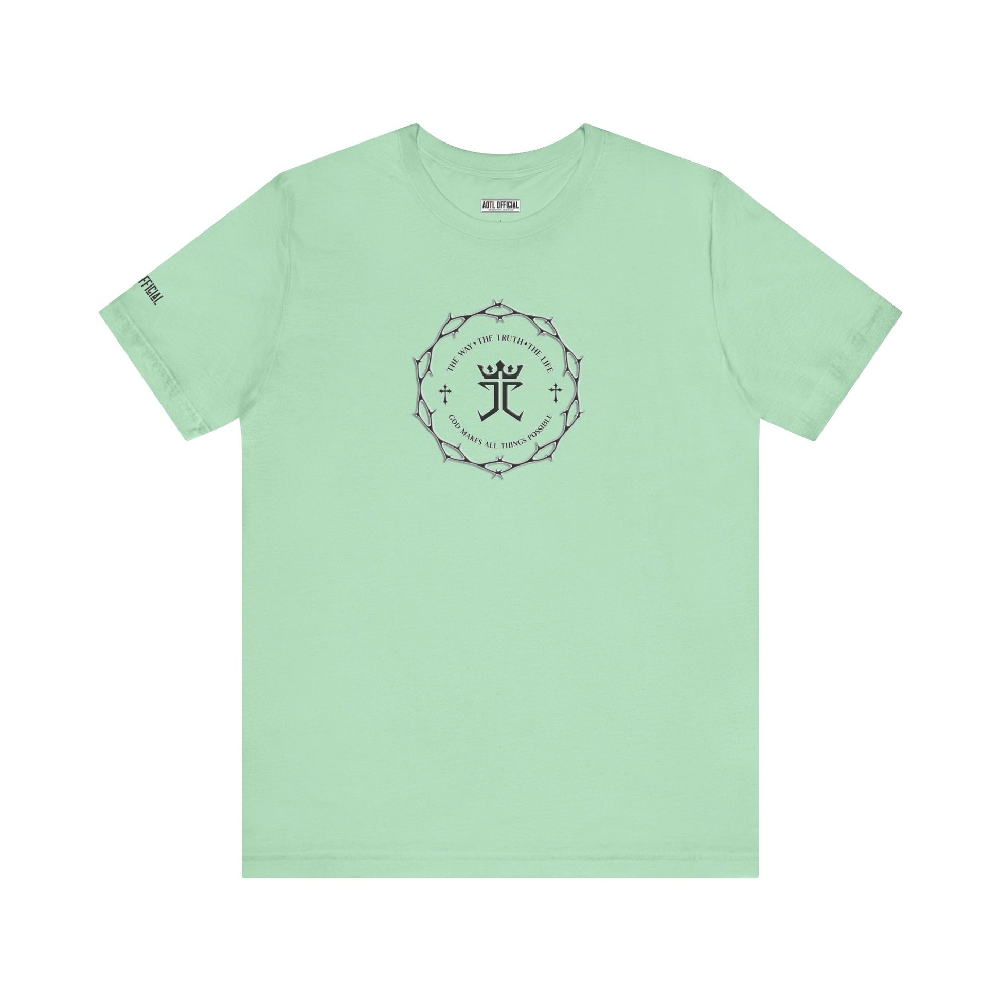 An enchanting design unveils a circle of thorns, symbolizing Christ's profound sacrifice, cradling a logo proclaiming Jesus Christ as the King of Kings. Within, echoes of profound truths resound: "The Truth, The Life, and The Way," alongside the unwavering belief that "All Things Are Possible with God."
