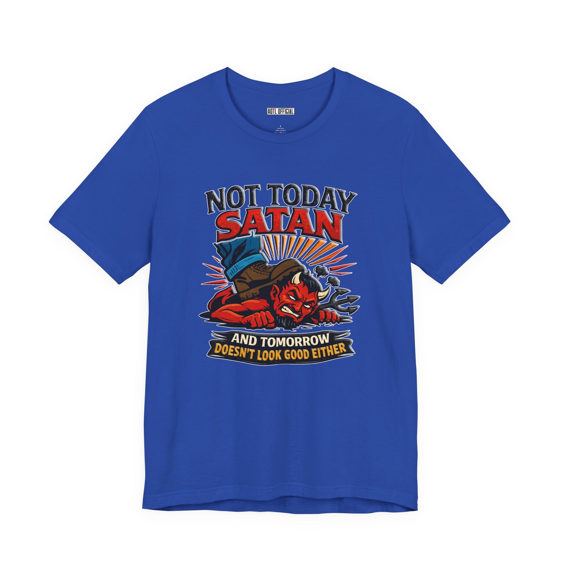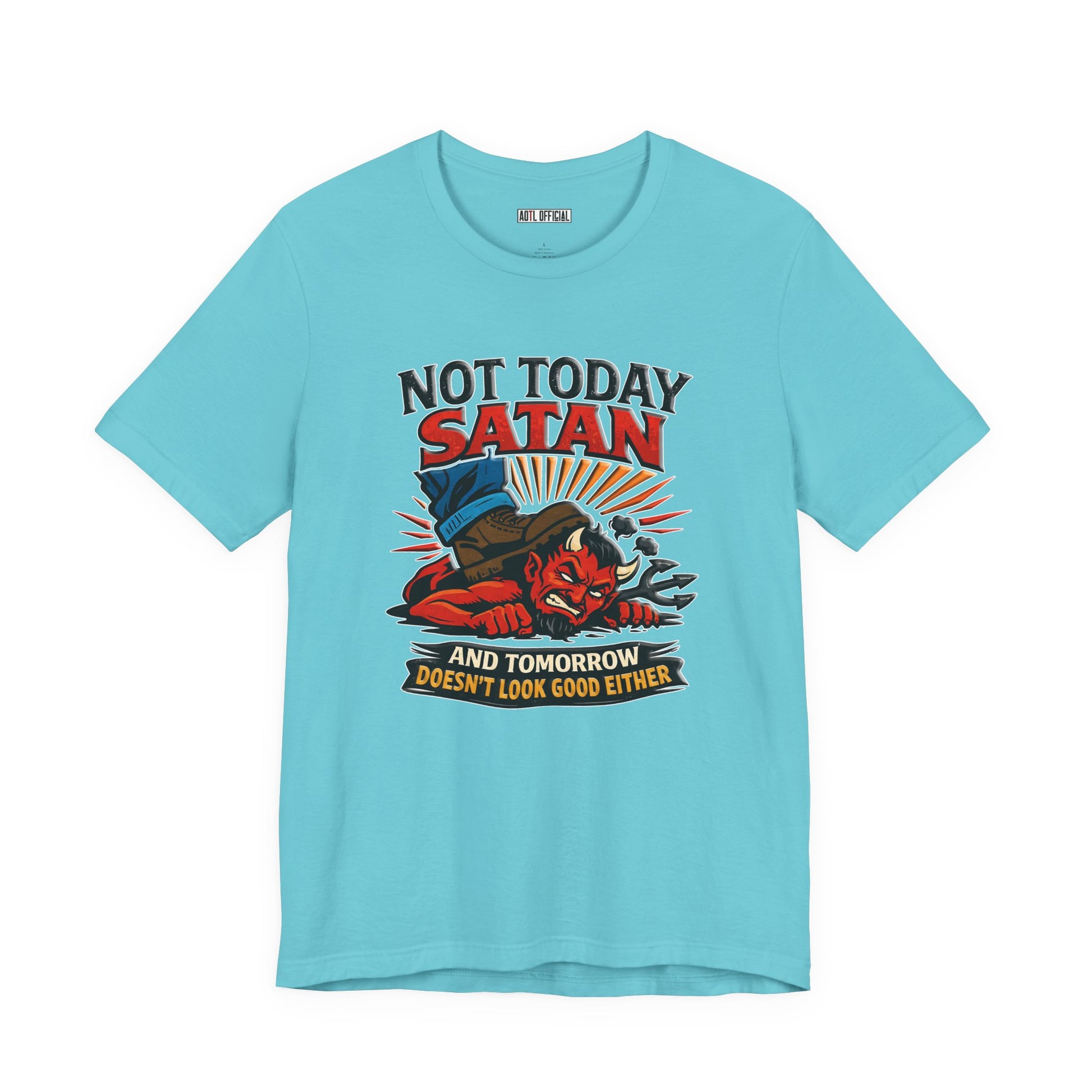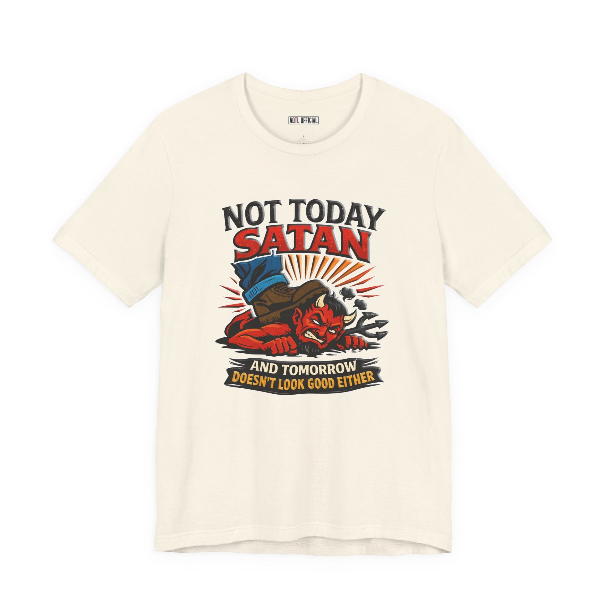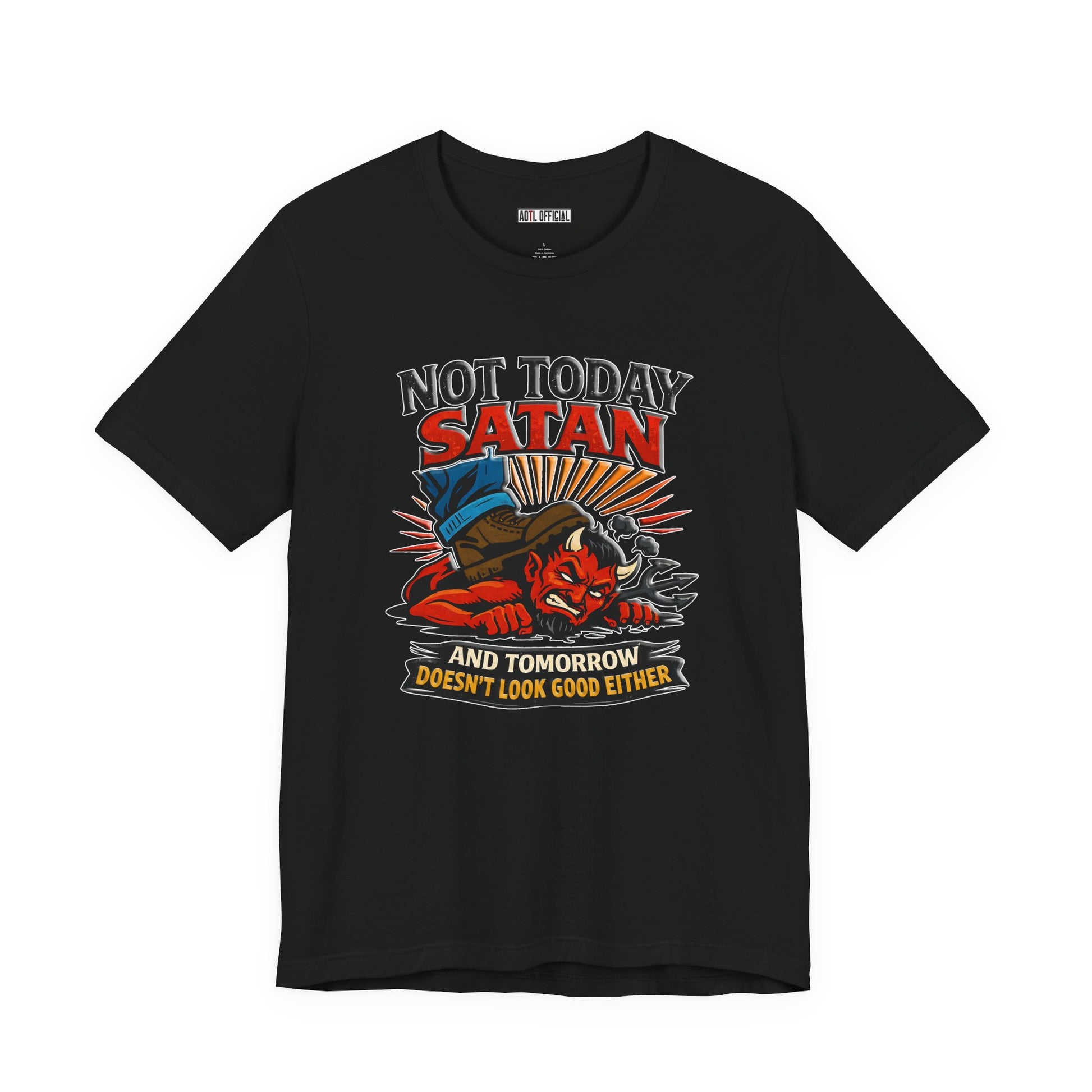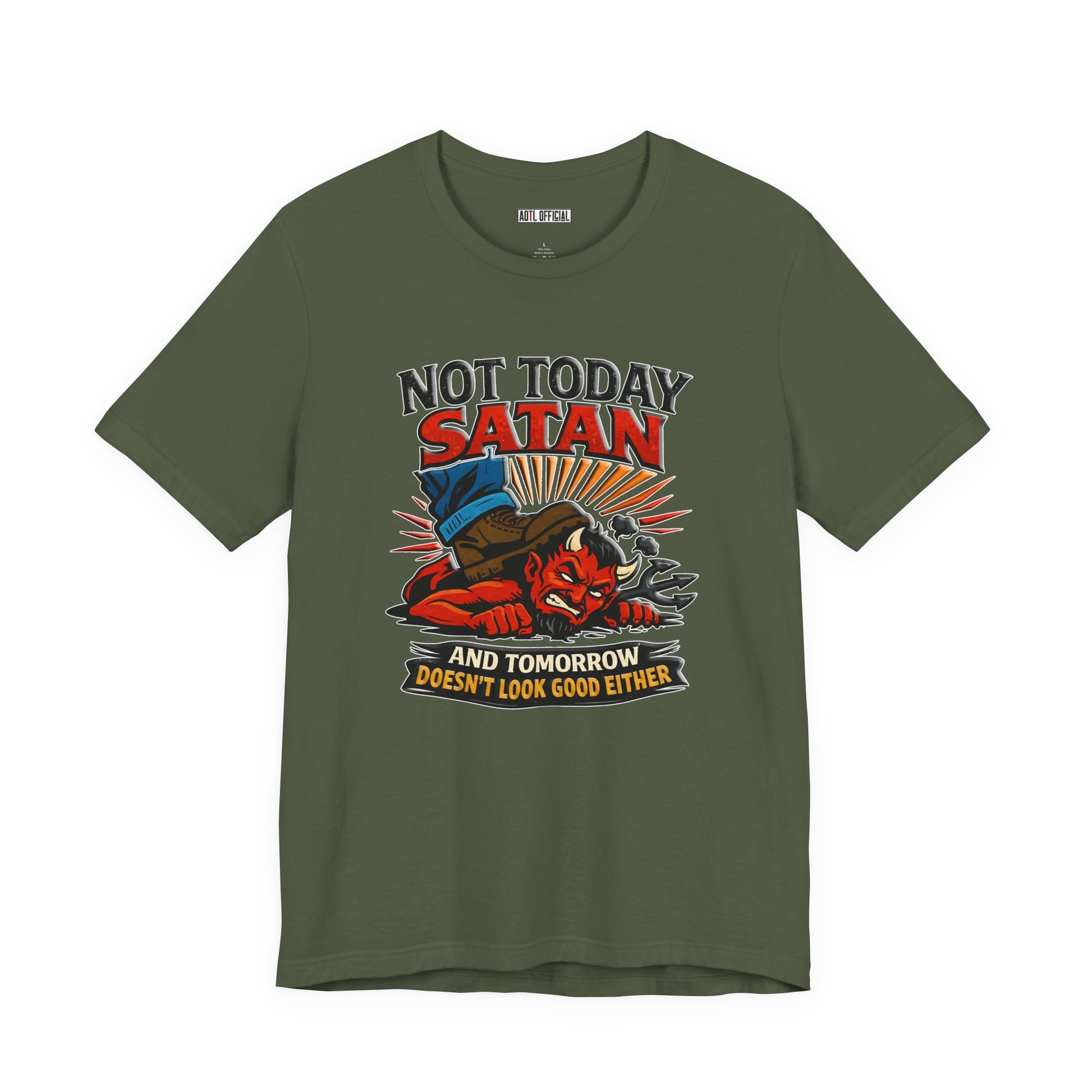 A fearless declaration of spiritual authority. This design depicts a triumphant figure standing firmly on the defeated enemy with the message ‘Not Today Satan — Tomorrow Doesn’t Look Good Either.’ A bold reminder that through faith, victory is already won.