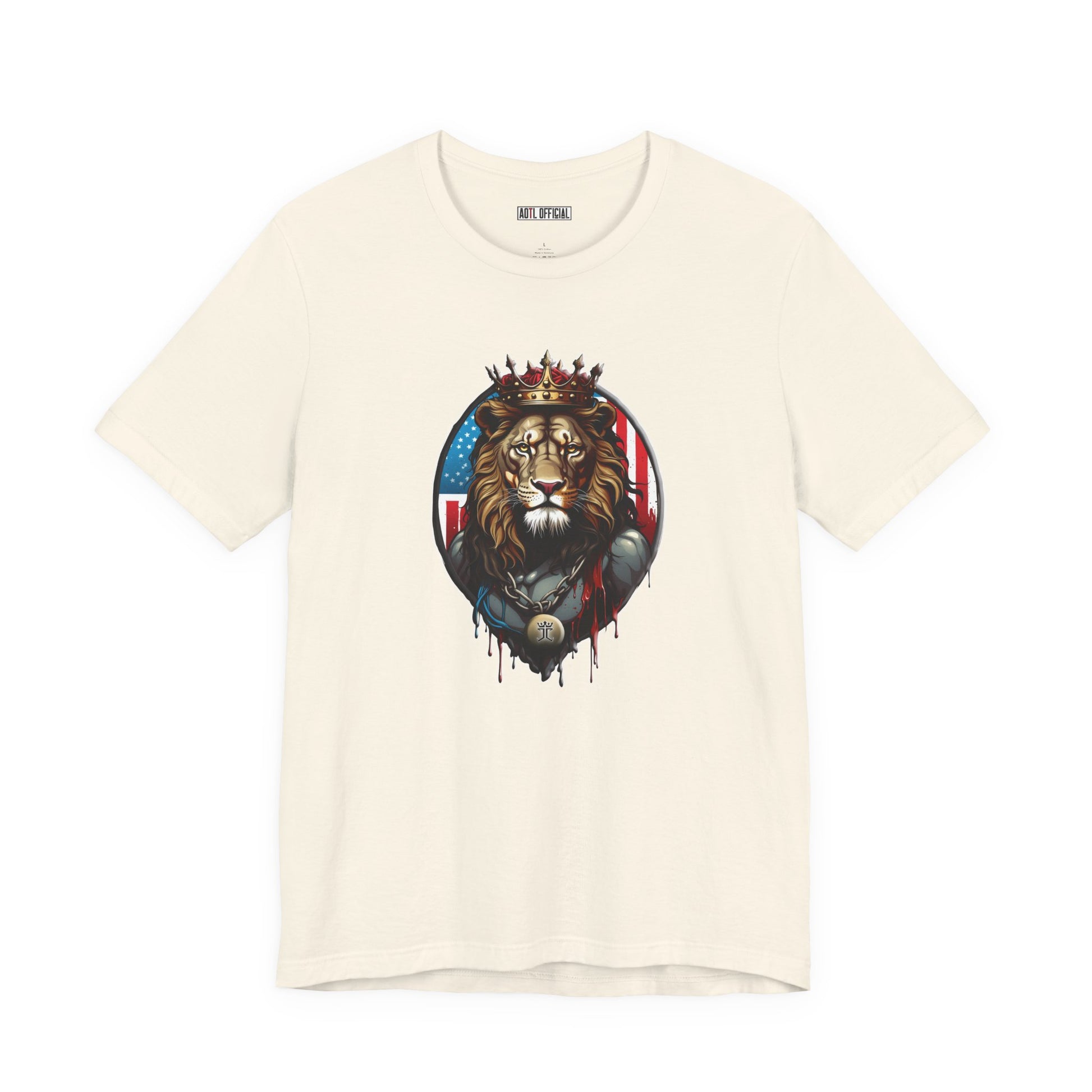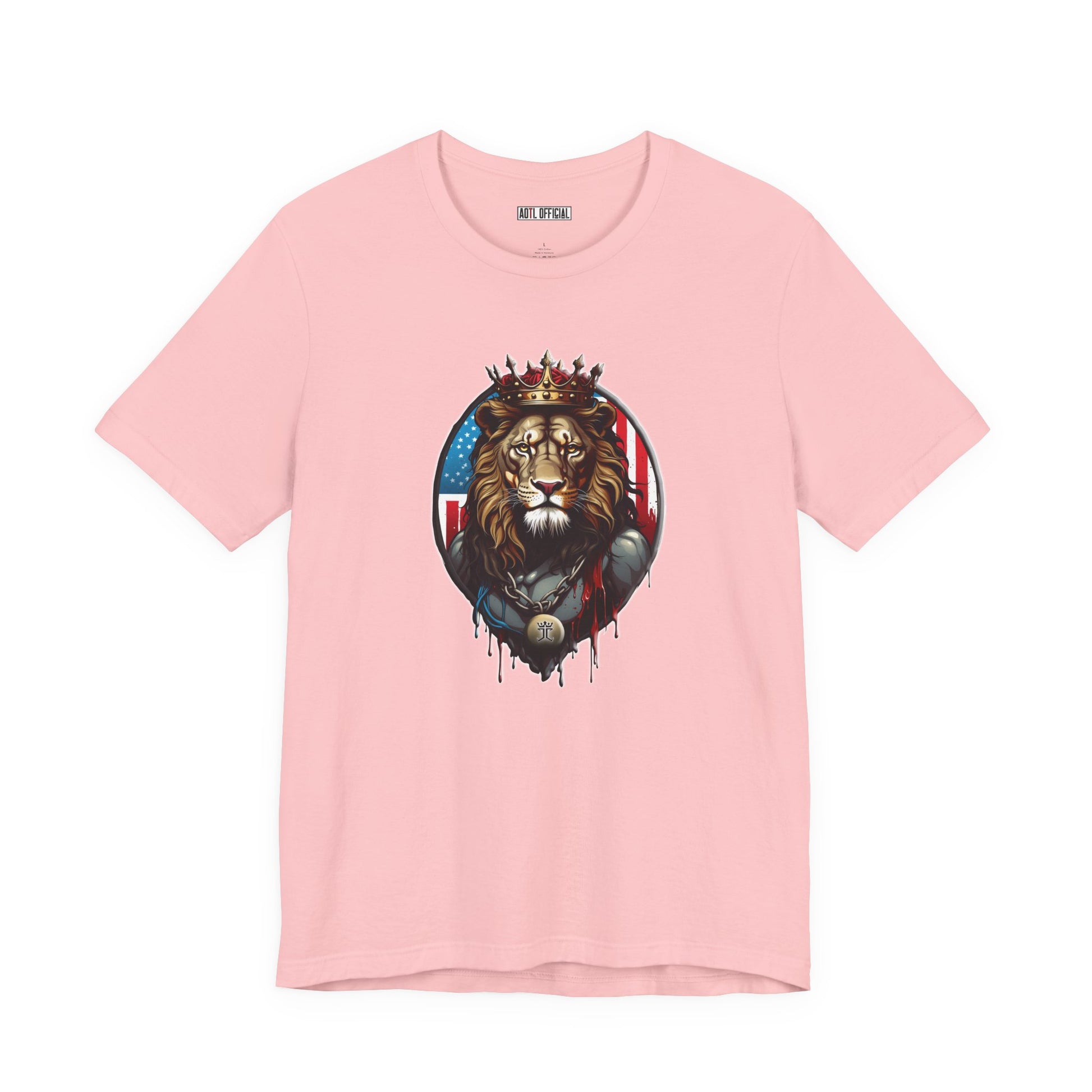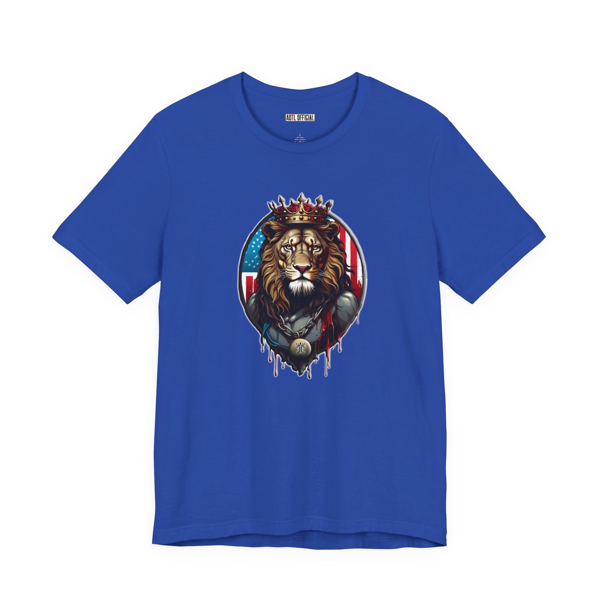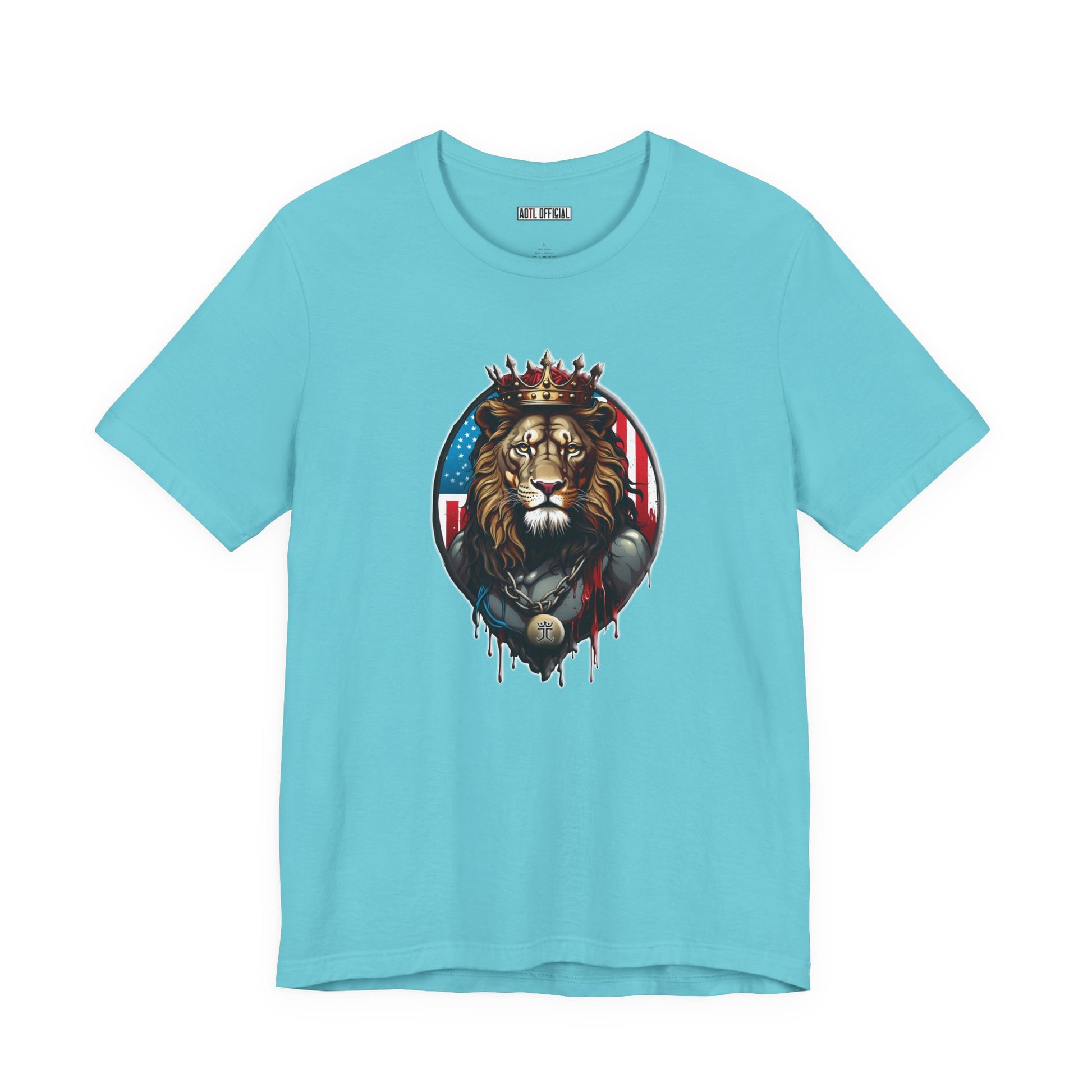 Behold the awe-inspiring image of the Lion of Judah, adorned with a majestic king's crown. This striking design captures the essence of regality and power, as the lion's piercing gaze exudes strength and authority. Behind him, the American flag unfurls, symbolizing his dominion over the land. With intricate detailing and vivid colors, this design is a bold testament to faith and sovereignty. Wear it proudly and let the lion's majestic presence speak volumes.