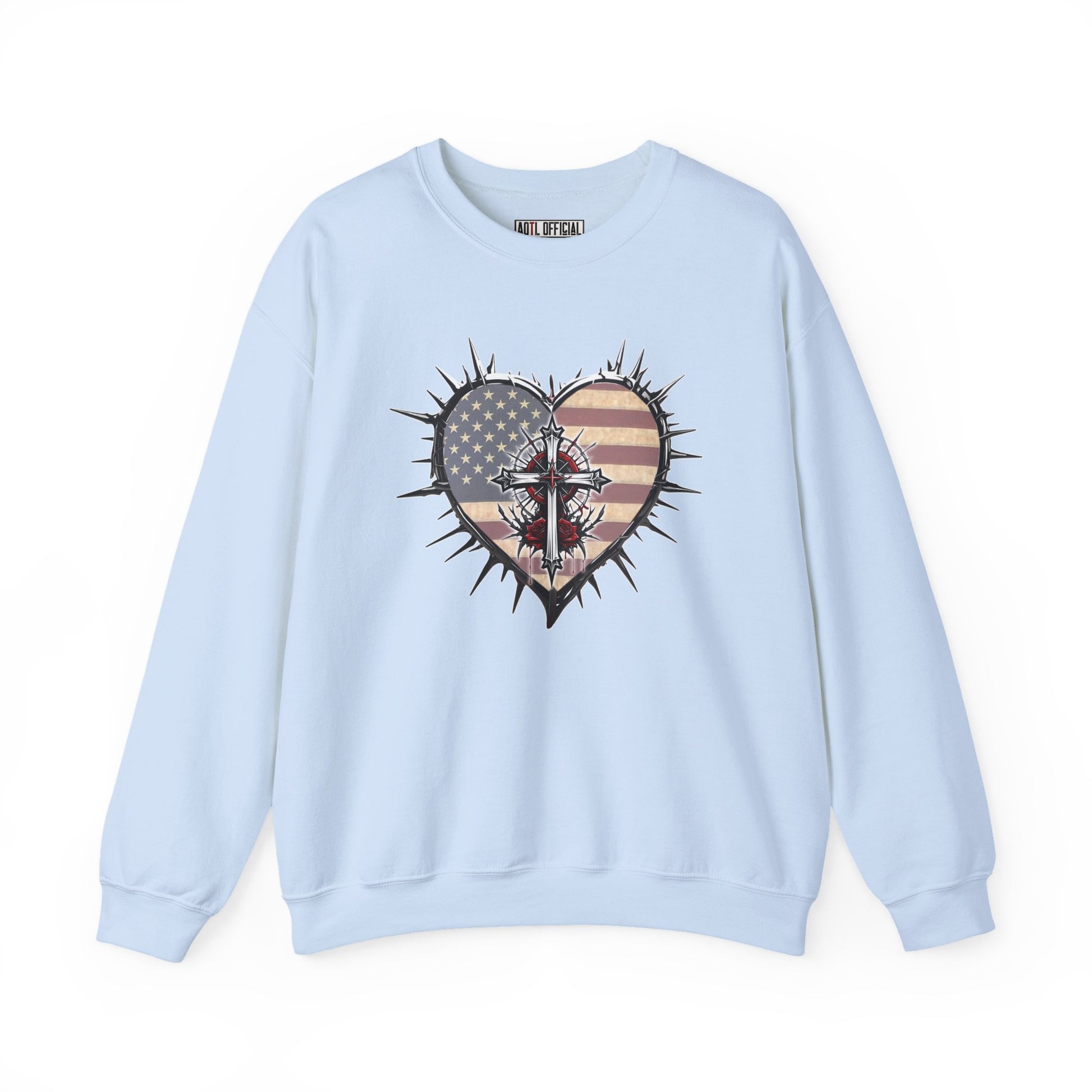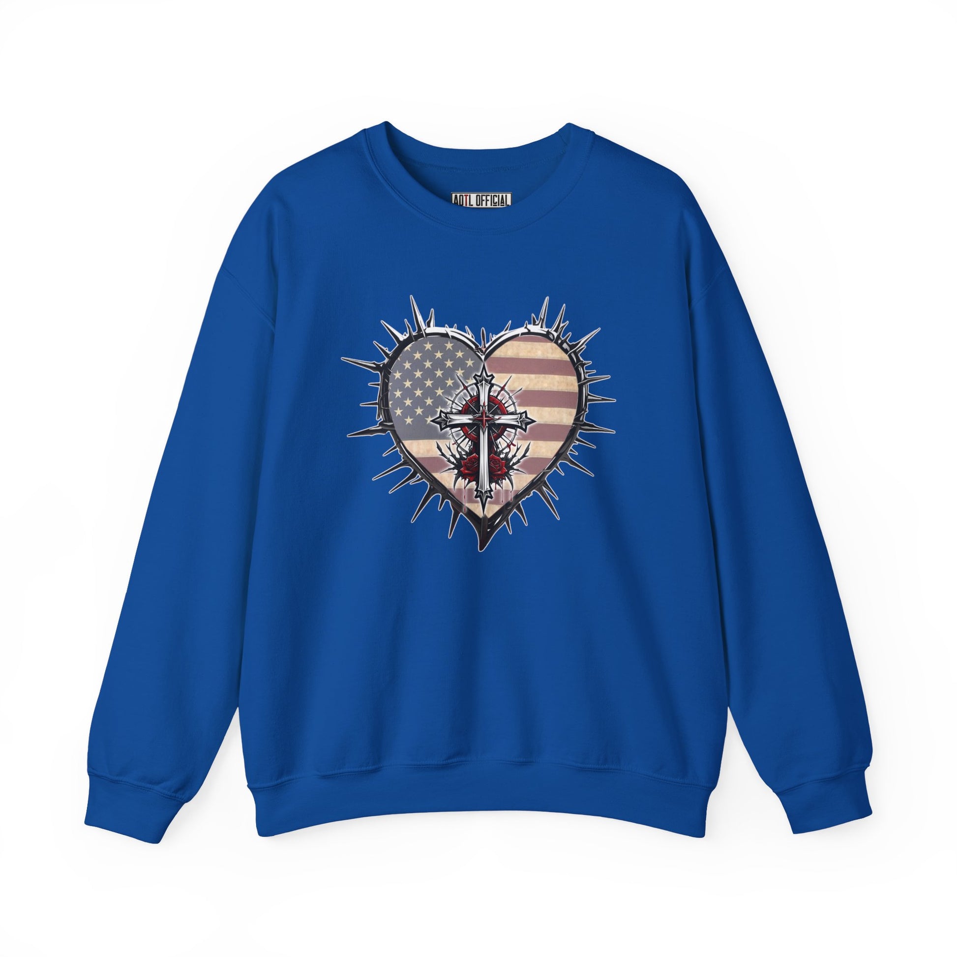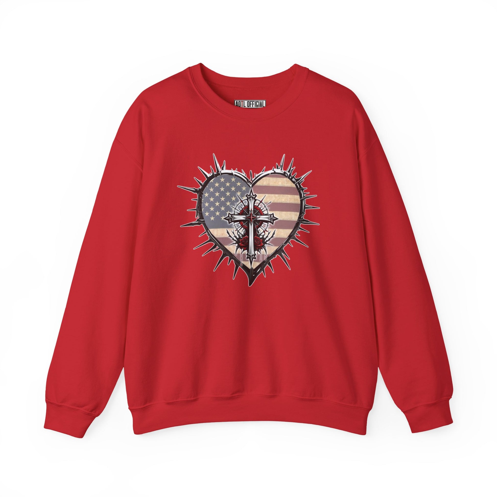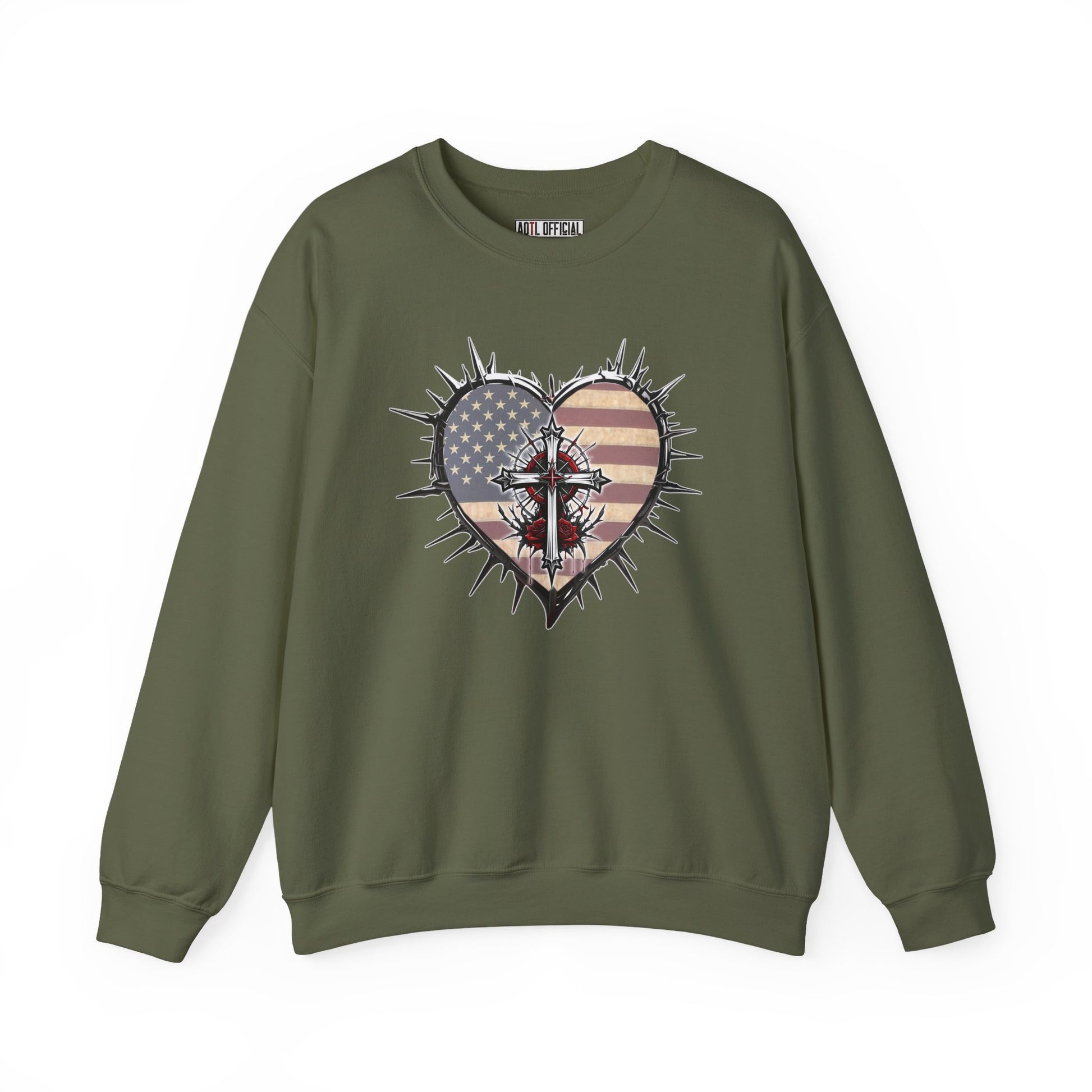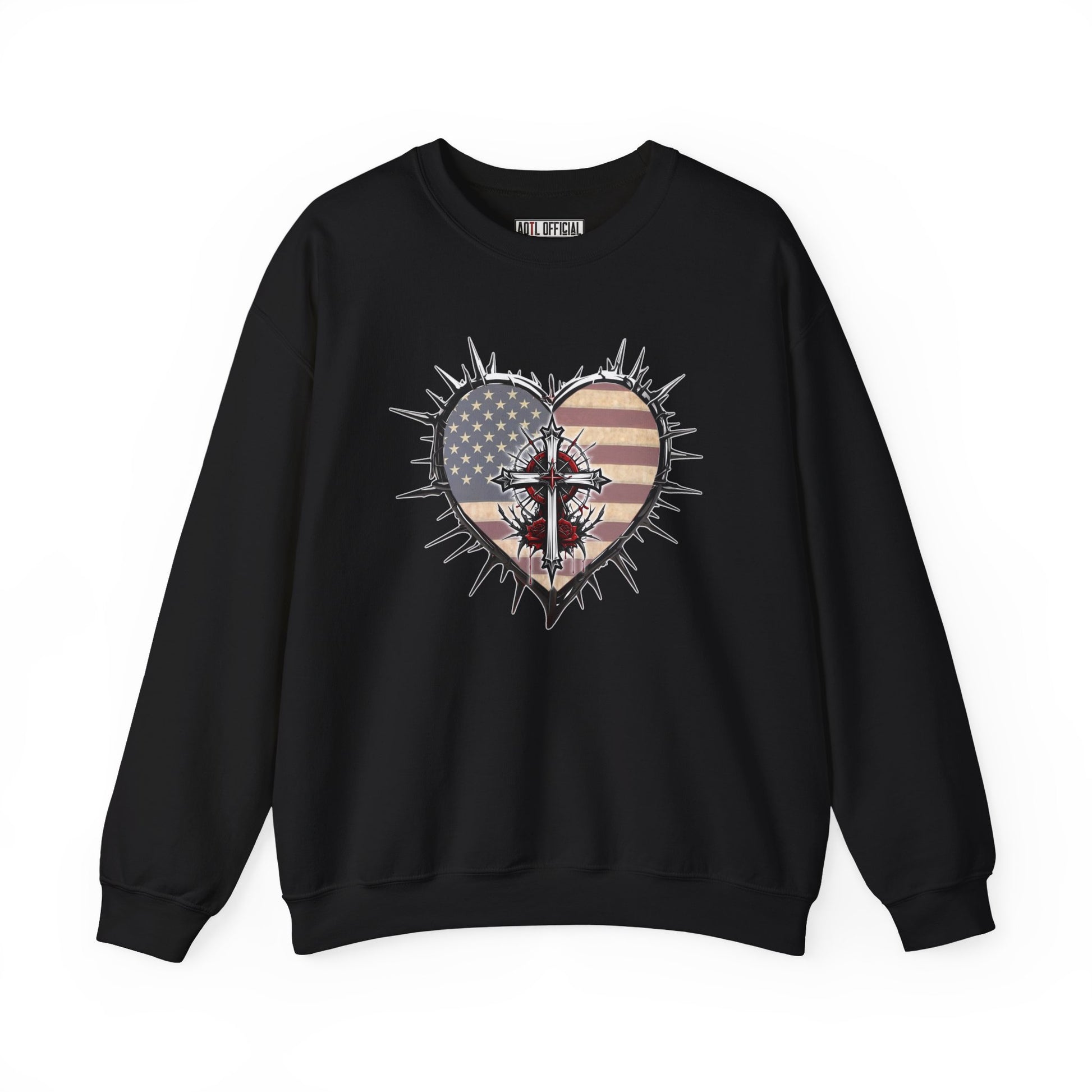 A heart of thorns cradles the United States flag, embodying Jesus' sacrifice and the resulting freedom and salvation for America. Inside, a cross with thorns and roses symbolizes Christ's enduring love. This powerful image unites faith, sacrifice, and national identity in a poignant tribute to America's Christian heritage.