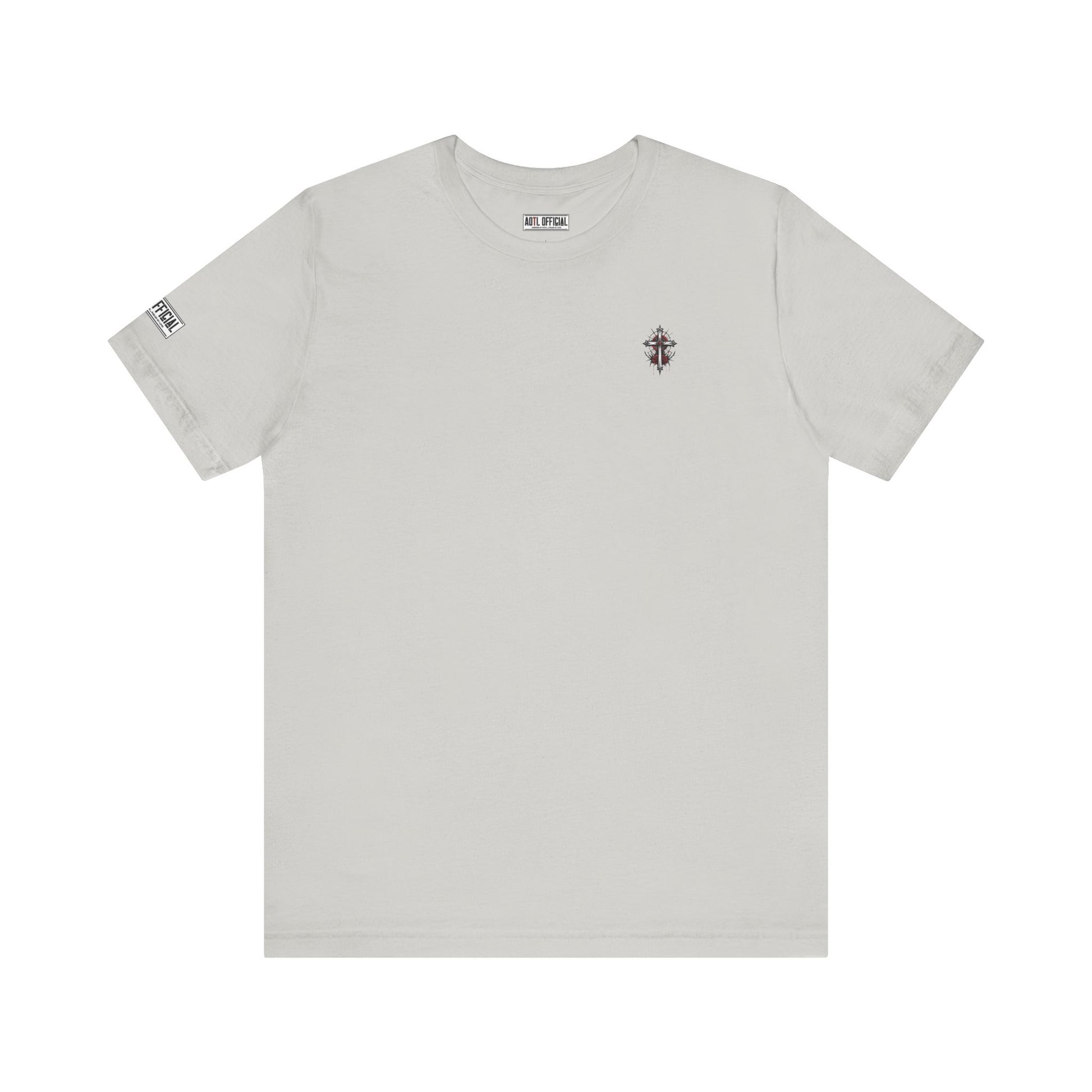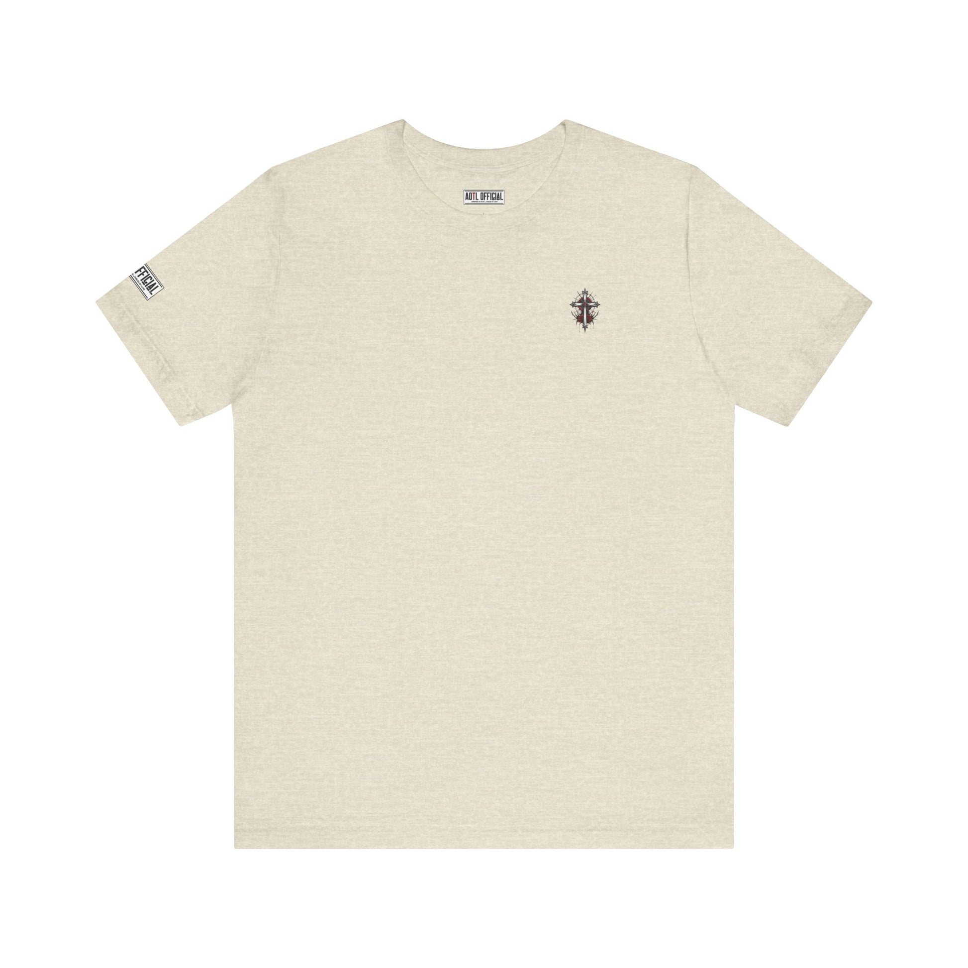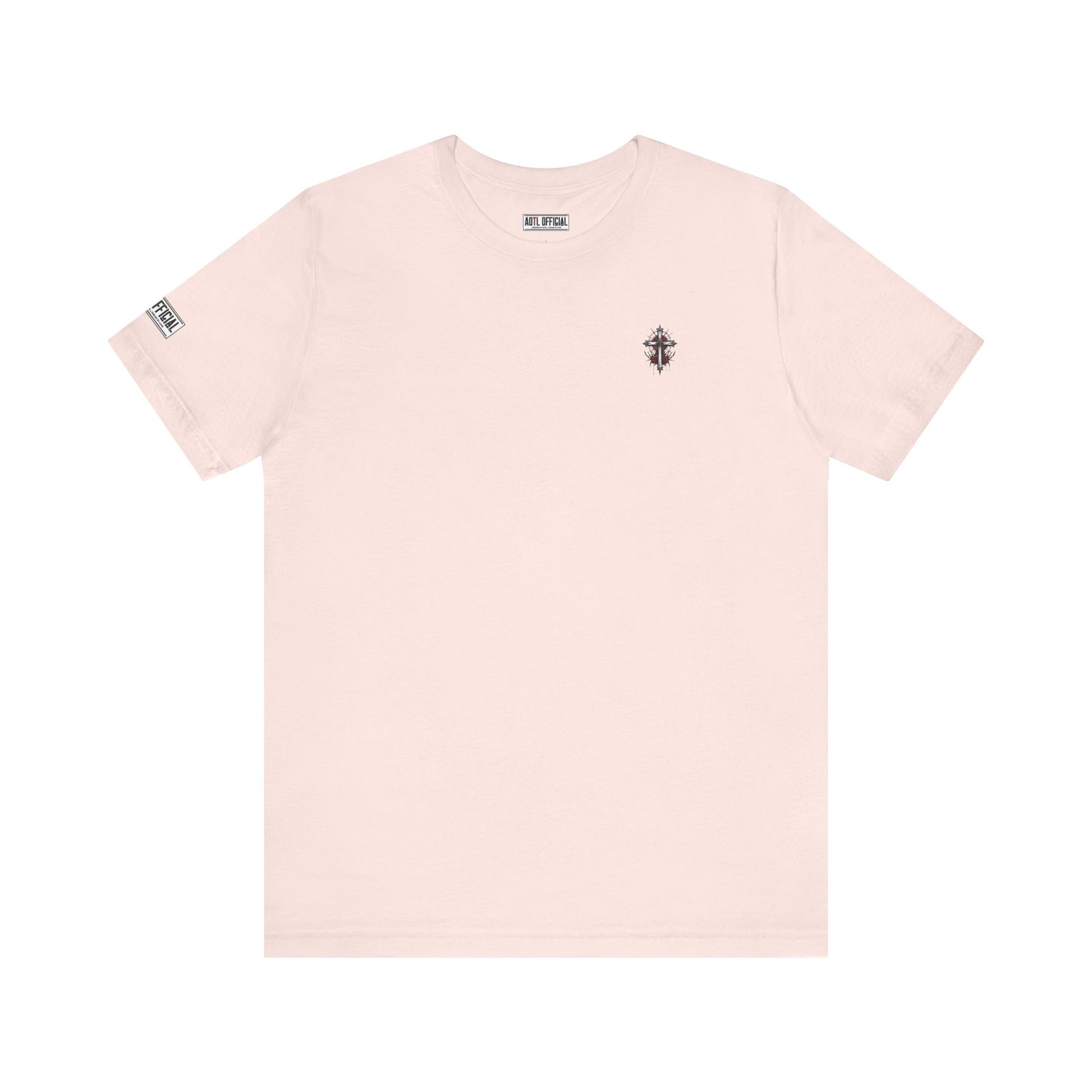 This Christian t-shirts blends comfort, subtlety and strength, designed for those who want their faith to speak with quiet confidence. Featuring a trending micro-symbol (Thorned Redemption)placed on the left chest. On the right sleeve, the company logo sits with understated elegance, complementing the design rather than competing with it. The result is a clean, balanced look—classy yet powerful—that allows wearers to carry their message of faith with dignity, style, and purpose.