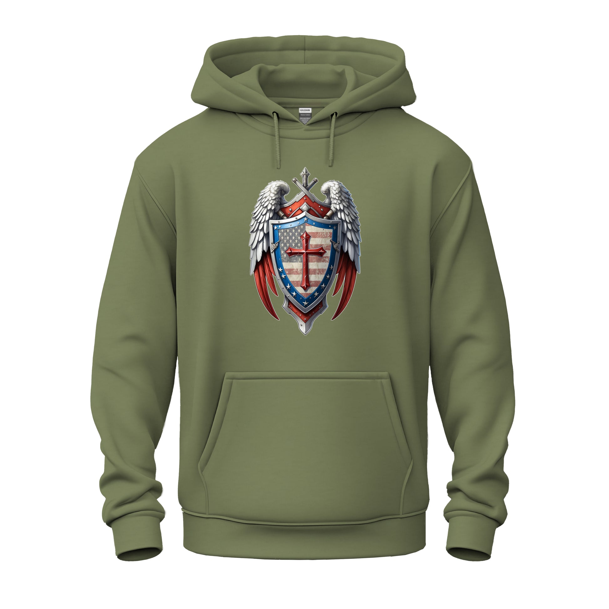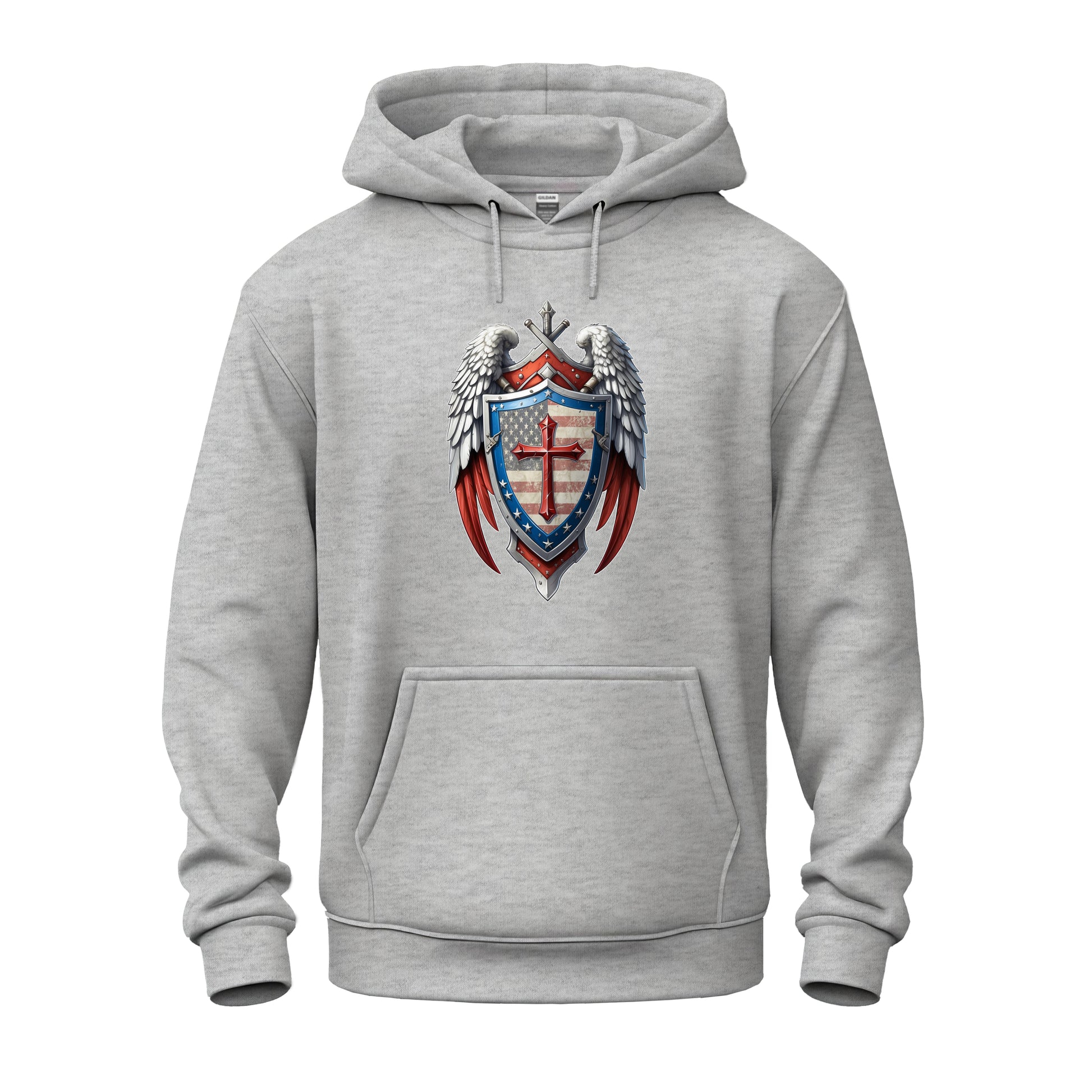 This emblem embodies a powerful fusion of faith and patriotism, capturing the essence of a celestial guardian. Wear this design as a symbol of divine watchfulness and national pride.